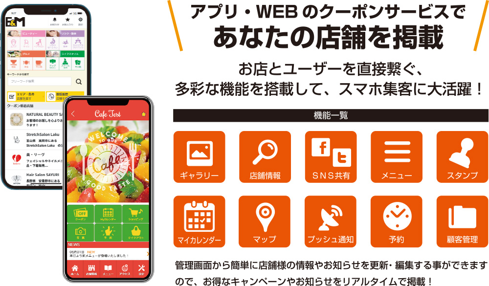 様々なSNSツール(facebook・LINE・X・Instagram)でお店のアプリ、キャンペーン情報やクーポンを共有してもらえます!