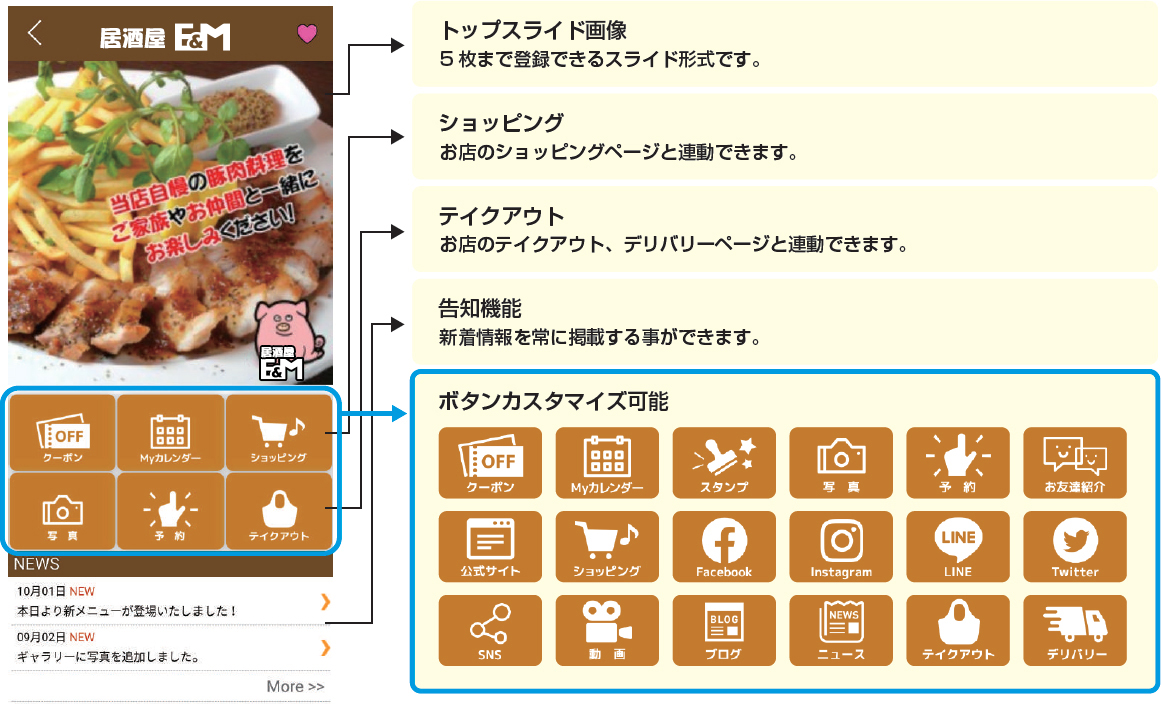 様々なSNSツール(facebook・LINE・X・Instagram)でお店のアプリ、キャンペーン情報やクーポンを共有してもらえます!